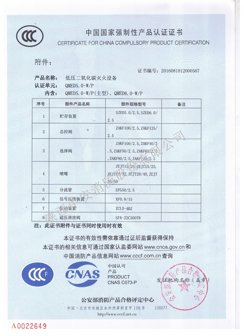 我公司順利取得低壓二氧化碳滅火設(shè)備3C證書